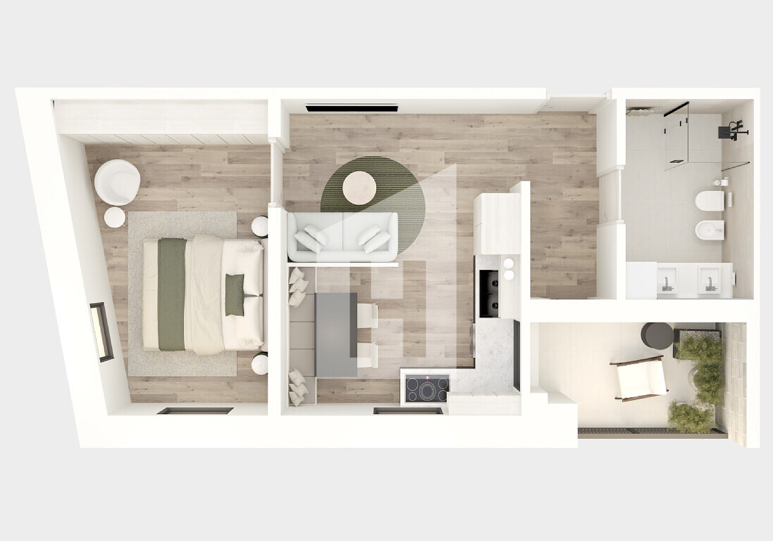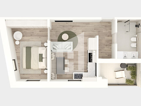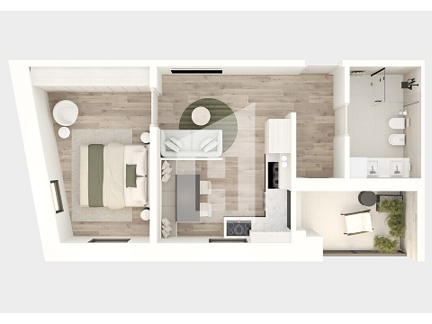 Ampio bagno, camera da letto, cucina-soggiorno, loggia